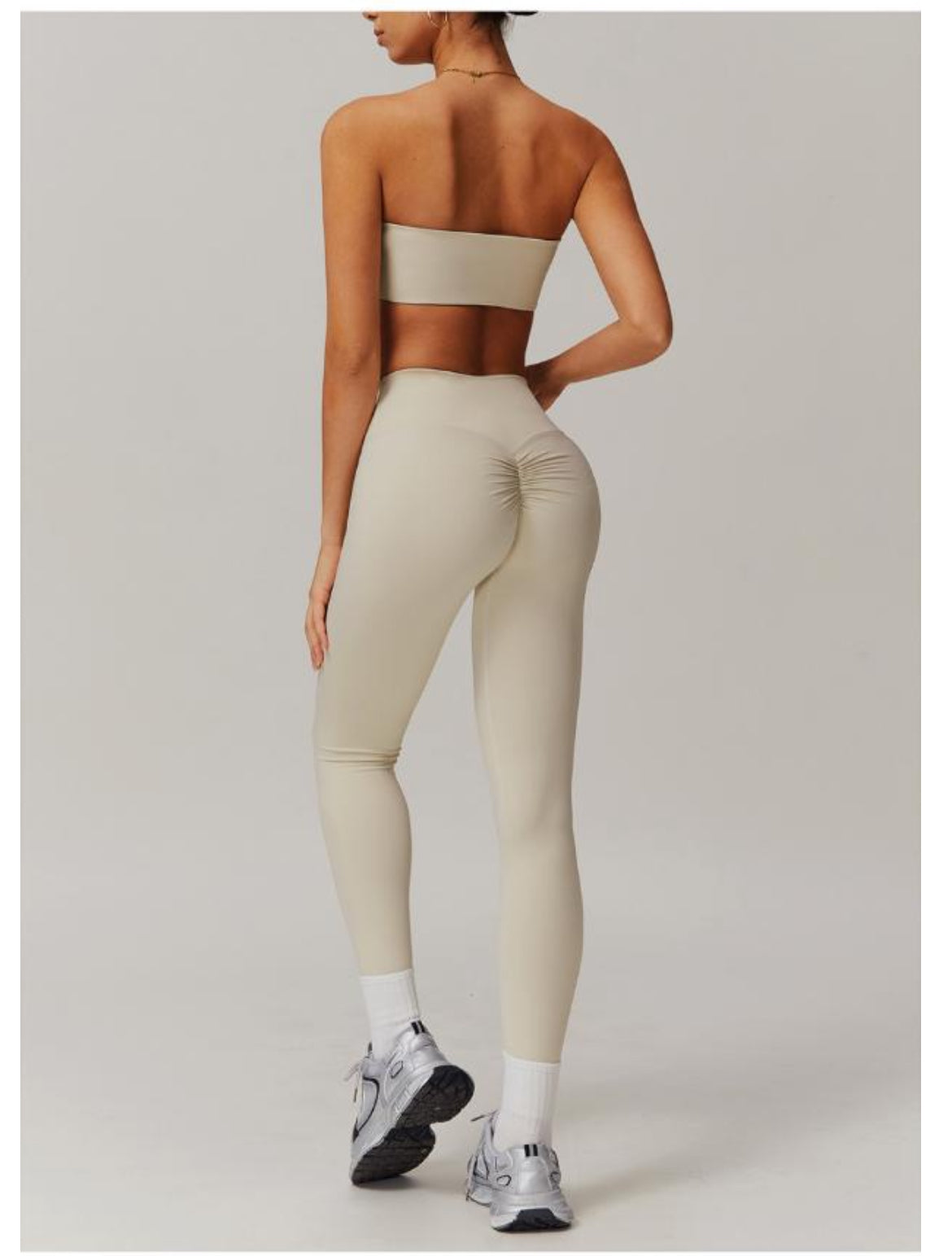 Este conjunto está hecho para resaltar tu figura con sutileza. El top tipo bandeau sin tirantes y los leggings de pretina alta con fruncido realzador en glúteo crean una silueta limpia, estilizada y femenina.