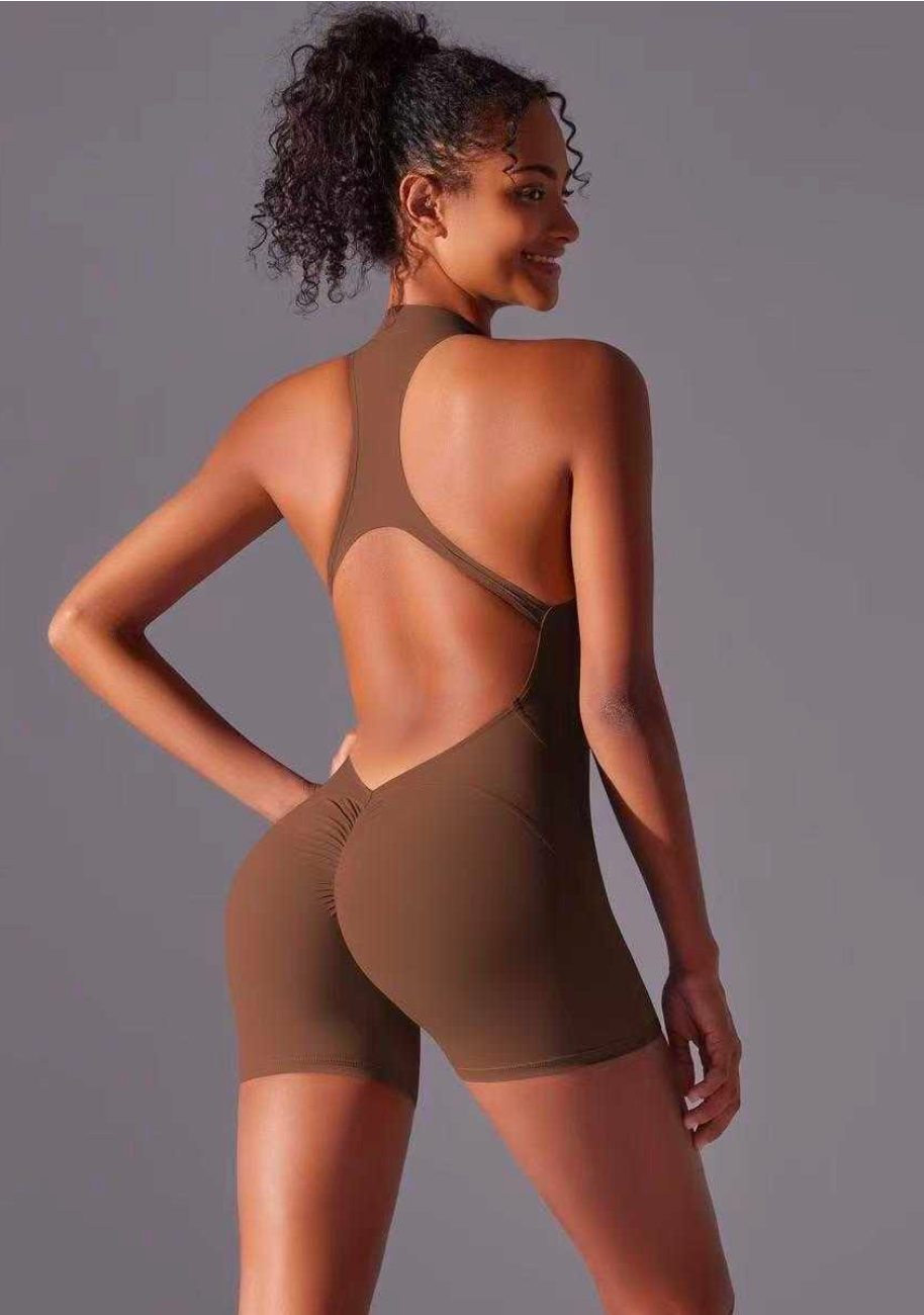 Enterizo corto en tono cacao, combina practicidad y estilo con una silueta que abraza tu figura.